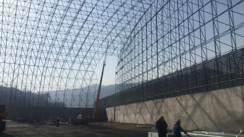 灵石九鑫工地上的钢网架工程在今年的2月20日正式复工。大家伙儿分工明确,各司其职,负责在地下拼装的在下面拼装,负责分类材料的在一边分类材料,经过一个多月的时间就快把网架全部吊装完成了。在这一个多月里,高处作业人员早晨7点就爬到将近28米高的地方,在上面安装杆件、球,下面吊机负责把拼装好的杆件吊上来,而在上面的作业人员则等杆件运上来以后,三四个人配合把这些杆件和球牢牢地连接在一起。经历了二十五天,在3月26日这天网架合拢了,项目部管理人员、施工人员还有甲方的领导们都是眉开眼笑的。网架合拢代表了网架主体工程上画上了一个圆满的句号。