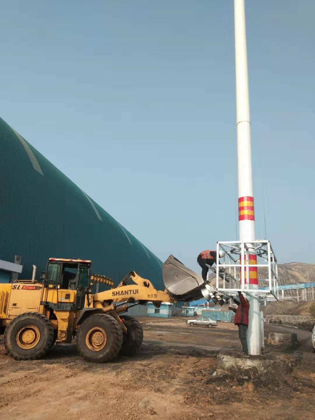 兴县蔡家崖集运站煤棚建成后,东边三个灯塔的灯光都照在了煤棚的的彩钢板上,就失去了存在的意义。经过与甲方沟通,我运行项目部决定将中间的灯塔改照道路,两头的灯塔改照煤棚两侧的广场,这样需要降下灯盘改造每个灯的灯光方向同时改变电源线路。由于灯的重量比较大,改变位置就要考虑灯盘的平衡问题,所以还要选好位置增加配重。原先准备邀请灯塔厂家来集运站改造,但是报价太高。为了给公司减少开支,也为了锻炼队伍,我项目部于11月8日下午开始对灯塔改造,晚上灯塔已经按照我们意图开始工作,效果令人满意。