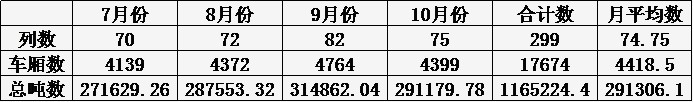长子项目部7-10月份共装车299列,发运车厢数累计17374节,完成发运量累计116.5万吨,平均每天装车2.43列,完成发运量0.95万吨。其中,9月份共装车82列,共计31.48万吨,首次突破月发运量30万吨大关。从整体水平看,未来生产任务会不断加紧,项目部应提前做好准备。