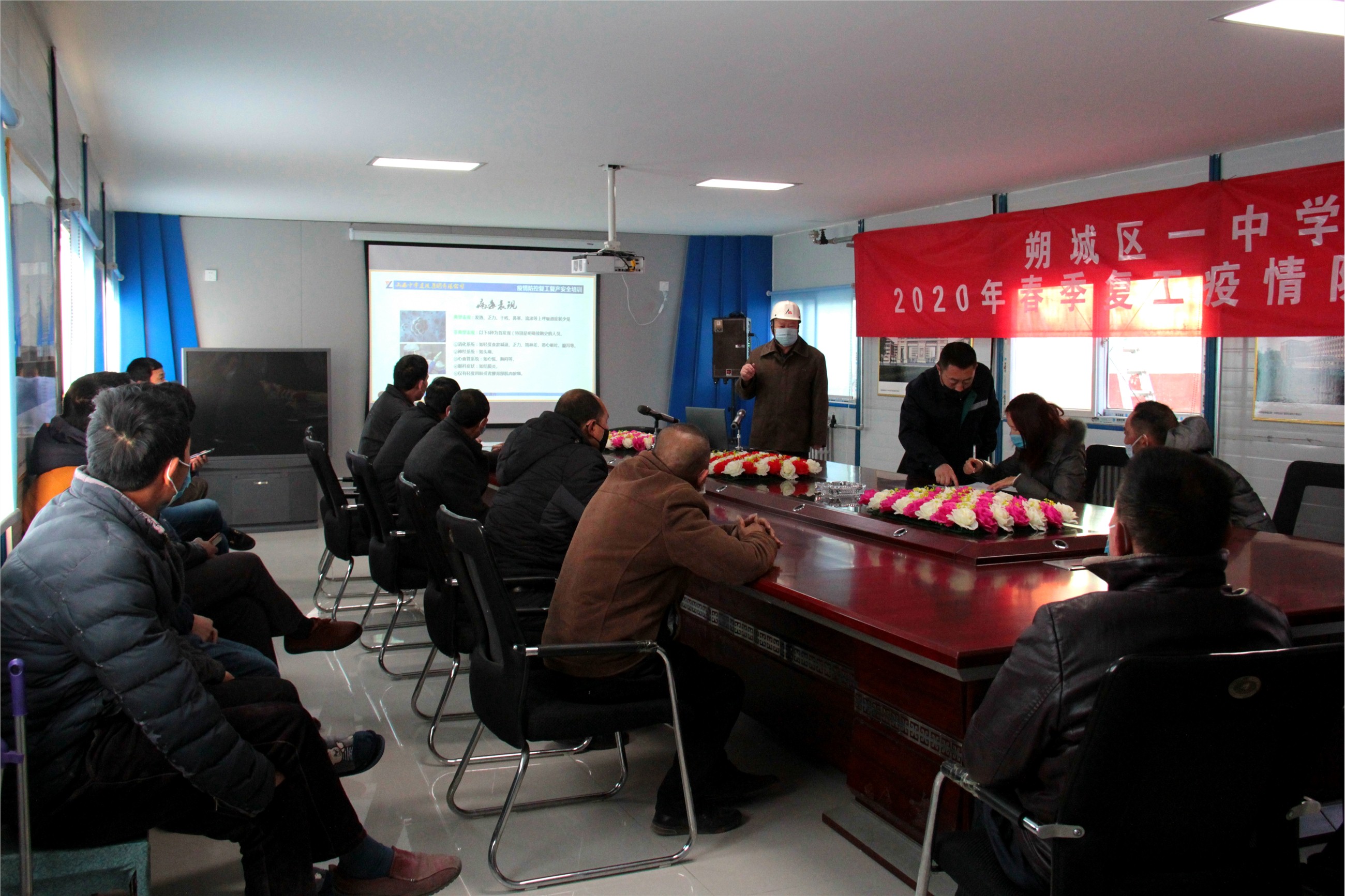 3月3日上午8时,质安部经理王宝林在项目部会议室对工人进行防疫知识、安全生产培训,详细介绍了此次新冠肺炎日常防疫的注意事项及复工后安全生产的要点。