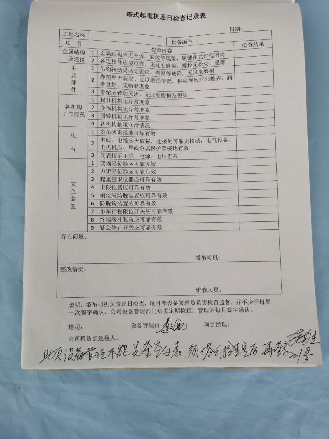 3月18日,公司质安部在对某工地检查中,发现了现场有一张塔司未签字、设备管理员先签字的塔吊检查记录表,这种做法从表面上看是一种表格填写不规范现象,但实质却是一种责任心缺失的表现。