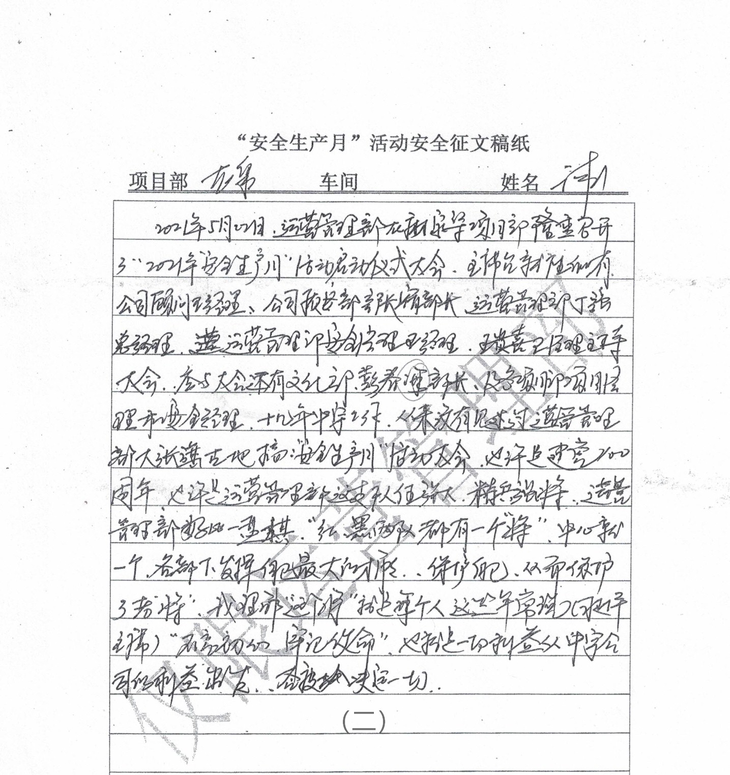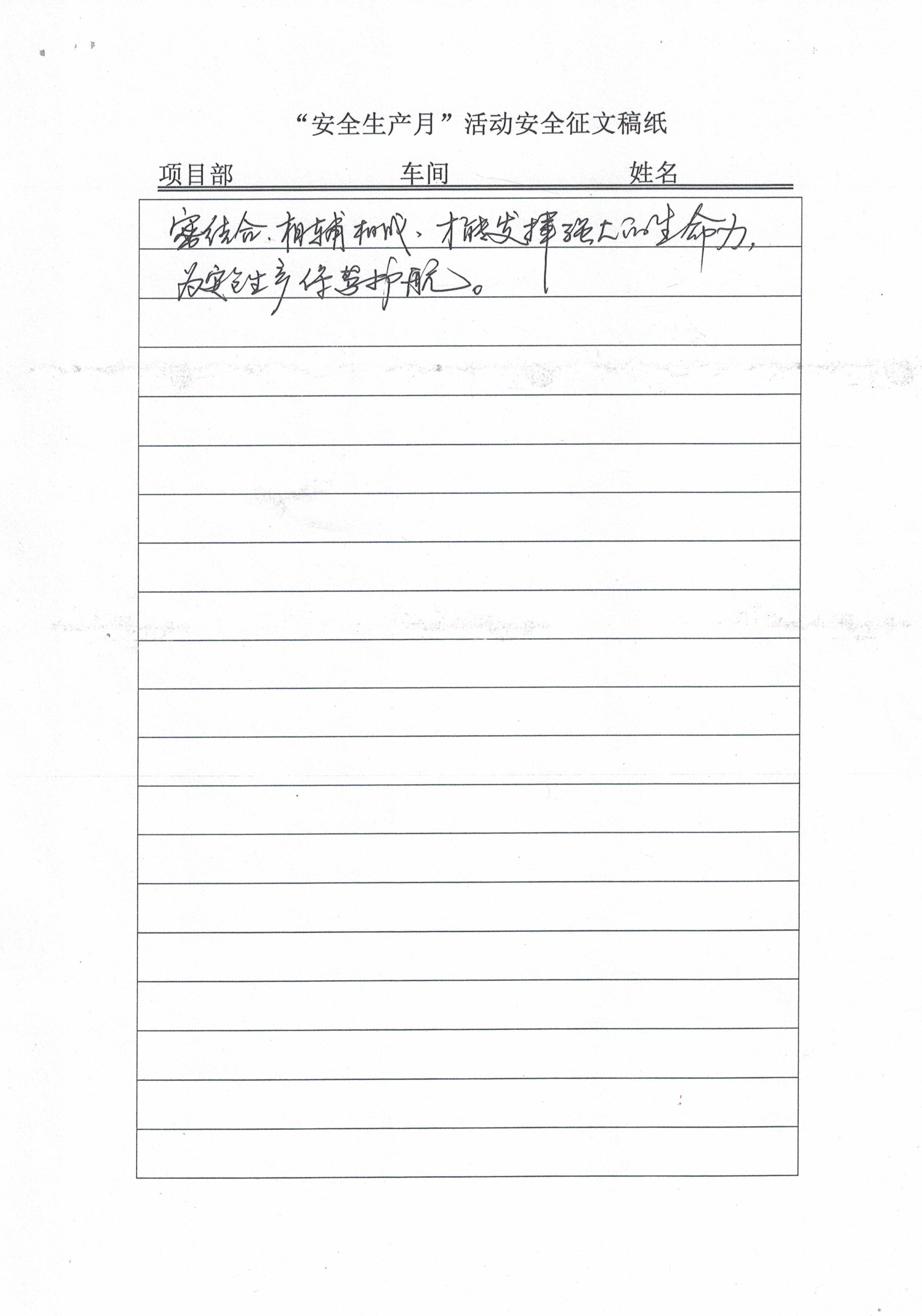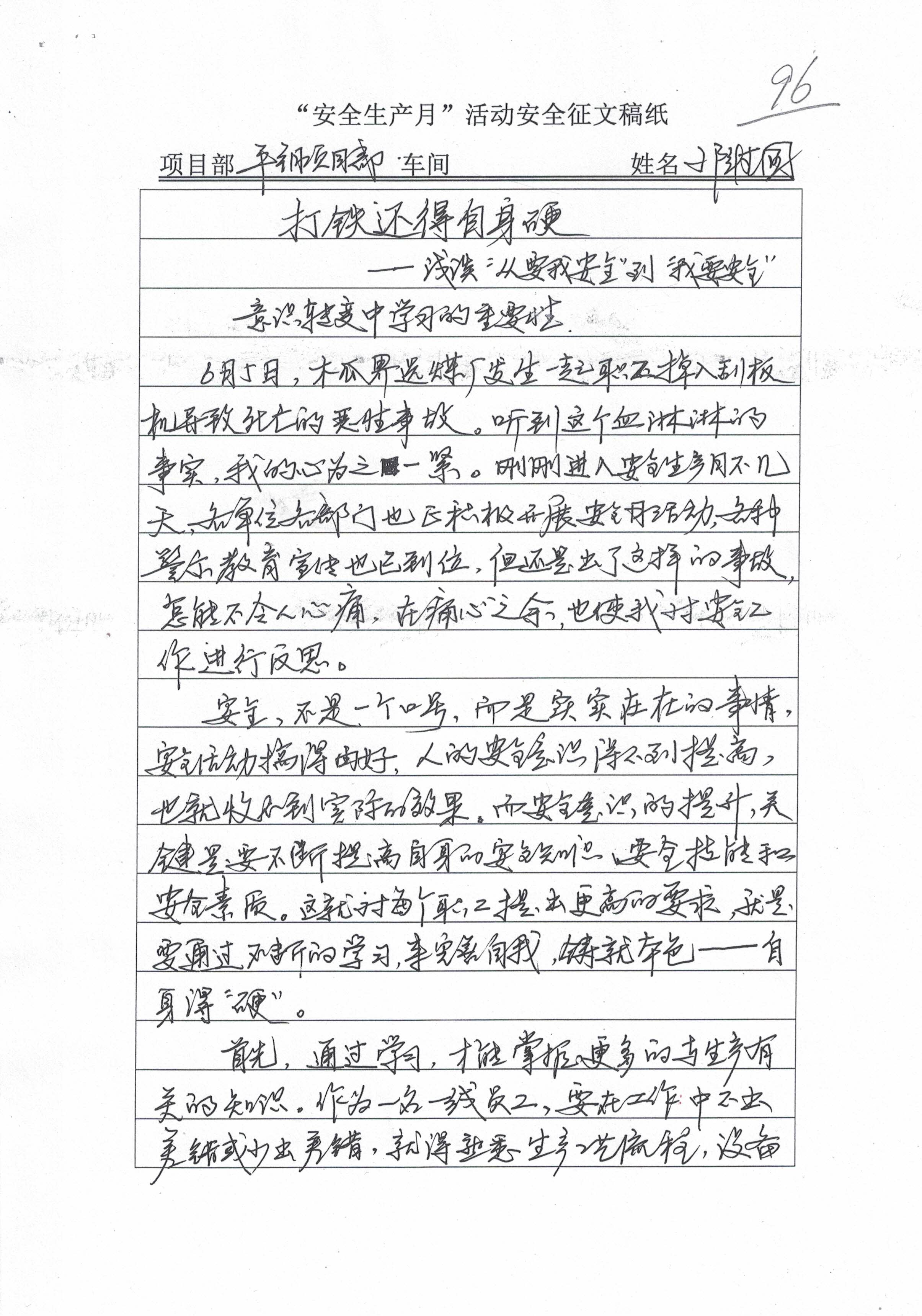 根据集团公司运营管理部关于开展2021年“安全生产月”活动的通知要求,运营板块各项目部在“安全生产月”活动期间,积极组织员工参与了“我要安全、要我安全”的安全征文活动。活动要求各项目部每个车间投稿不得少于两篇,必须手写,且字迹工整,字数不低于300字。活动结束后,考评组对各项目部安全征文进行了考评,评选出一等奖三名,二等奖五名,三等奖十名。从本期开始,《中宇简报》将择优选登部分获奖稿件,以供各位员工借鉴、学习。