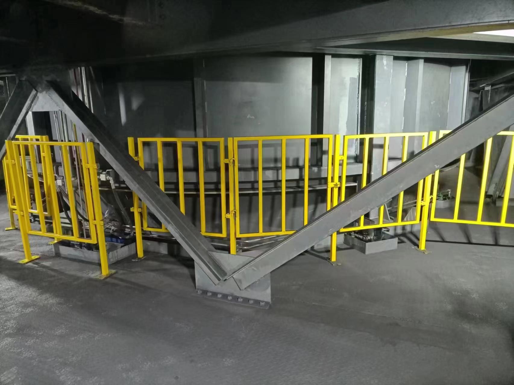 在工人们忙着各自工作的时候,我与电焊工配合进行部分整改。共同制作三个吊装口、装车绞车和计量仓、高压接触网上边的护栏(制作、安装和刷漆)、装车塔从上到下的接地线、两部皮带的机头溜槽防尘帘等。因两个皮带的失速开关运转起来跳动大,数据不准,所以我们立即进行改造,改造后达到了预期效果。为预防装车溜槽掉在高压防护网上发生重大事故,我们为装车溜槽安装安全保护销,此项改造得到了专业人士的高度赞扬。2号皮带拉紧装置属于液压拉紧,为了防止失压造成皮带损坏,我们增加了钢丝保护绳,同时为液压拉紧装置制作了17片安全防护栏。暗道2号皮带运转起来上下晃动太大,容易造成皮带断裂,改造后运转正常。装车塔钢梁架晃动,经过改造,稳定运行。根据以往经验,我发现绞车钢丝绳已经出现断裂,若是在工作中发生断裂,溜槽会碰到火车上,从而出现重大事故,工人随即更换了钢丝绳,解除了这项隐患。