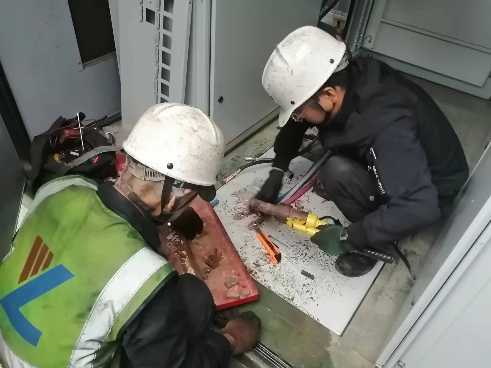 主电缆(3*95+1*25)100米,铺设是从0米到5层。当天下着雨,房顶湿滑,作为项目经理的我,站在5楼房顶指挥拉拽,并在拉拽前要求职工系好安全带,挂在牢固的固件上。大家齐心协力,一气呵成完成主电缆铺设工作。后续大家继续剥电缆、压线鼻、接线,空载调试,直到晚上10点各负荷都送电完毕。
