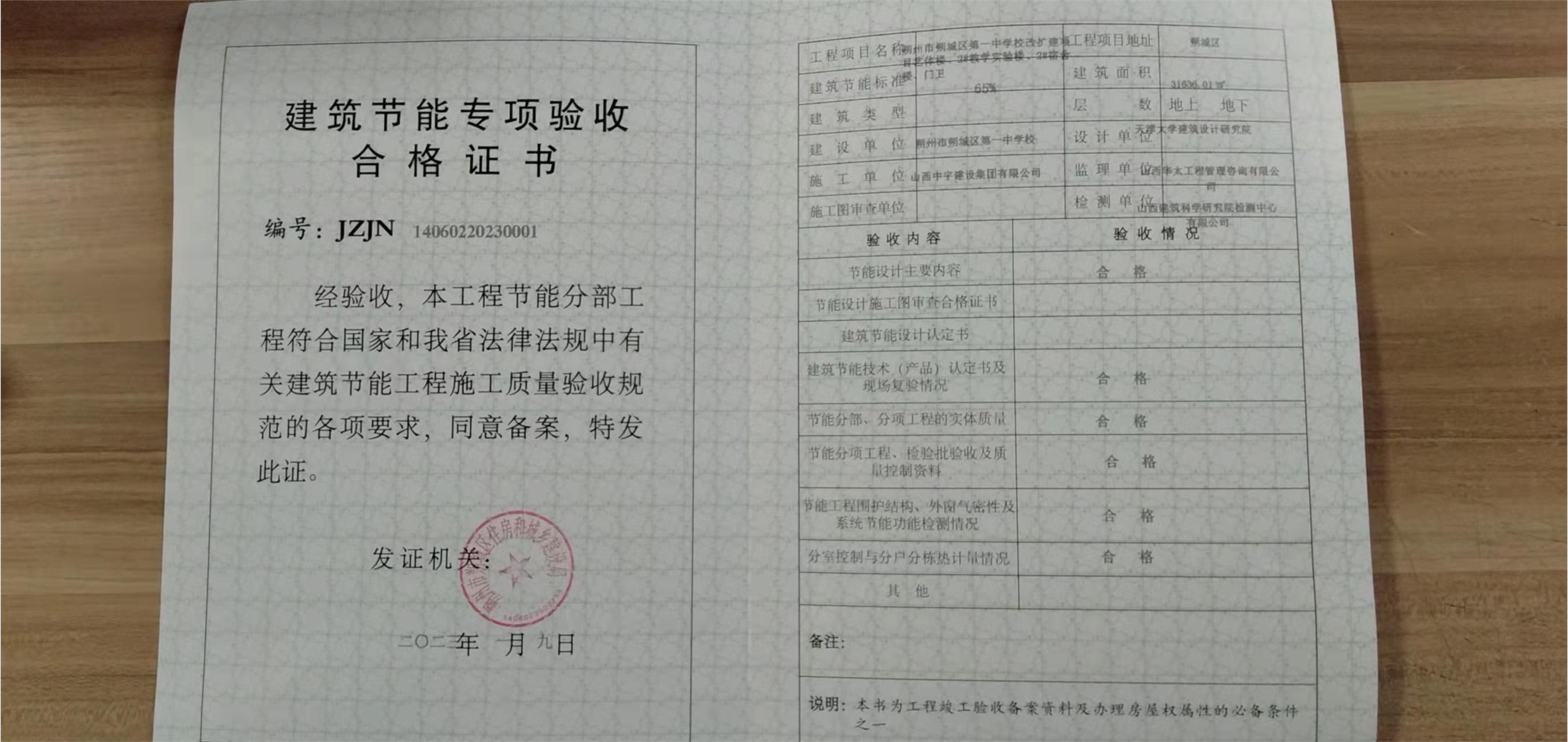 朔州市朔城区第一中学校改扩建工程项目二期工程经过近一年的艰苦奋战,于2022年10月中旬顺利完工,但因疫情影响,验收工作迟迟未能推进。12月底,在分公司经理赵军、项目经理田晓雷的牵头配合下,经过近半个月的时间已完成了节能、消防等专项工程的验收工作。