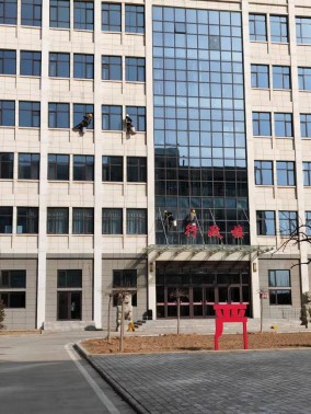 清洗前,项目部与清洗公司签订了施工合同和安全协议。施工过程中,设置专人现场监管,并在现场设置了明显的安全警示标志、警戒带,严禁非施工人员进入施工区域,严防安全事故的发生。清洗时,“蜘蛛人”按照行政楼、公寓楼、餐厅的顺序,沿楼体外墙自上而下进行作业。每到一处,“蜘蛛人”先用清洁剂清洁外墙玻璃,针对玻璃上难清洁的污渍用专业工具清理,再用玻璃刮将玻璃上的污渍泡沫刮除干净。清洗后,玻璃干净明亮,在夕阳的照耀下熠熠生辉。本次行动安全、高效、有序,取得了良好的效果,获得了甲方领导和职工的一致好评。