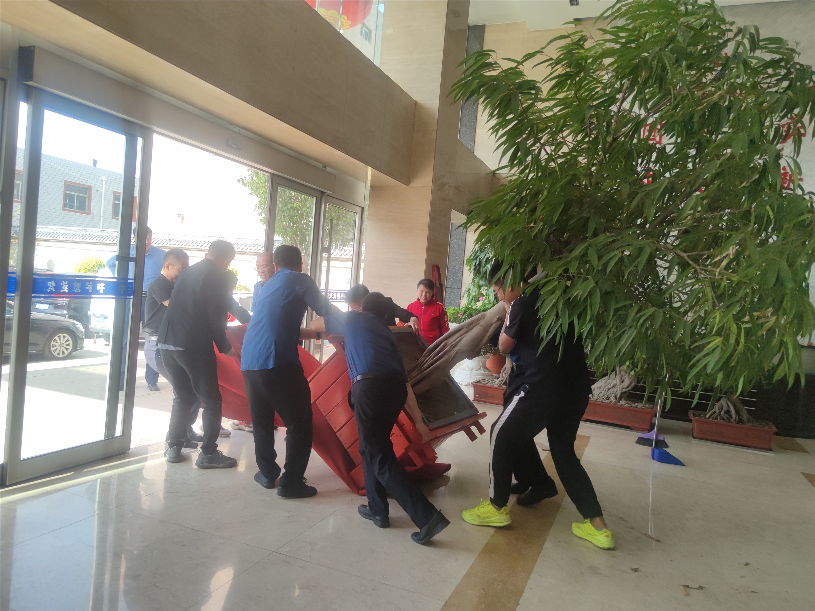 这十多位男同志们看着这盆盆栽,一时无从下手,因为盆栽实在是太大了,重两千斤,高五米,想轻轻松松将盆栽移动出去可不是件容易的事。必须想个好办法,首先大家先将盆栽从边角移动到大厅正中心,但继续平行移动可行不通了,盆栽高度远超大厅门的高度,因此只能将它放倒再移出去。突然间,有人灵光一闪,想到了一个方法,那就是将地毯放在花盆下方,再将花盆倾斜,这样一来只需拉动地毯,就能将盆栽拉出门了。一有办法说干就干,男同志们有的护着盆栽的树干部,防止其倾斜角度过大,折断树枝;有的紧紧抓住盆栽四周,以防其直接摔落造成木质花盆破裂;有的将地毯卷起来,置于花盆下方,调整地毯角度。一通操作之下,盆栽已按预想姿态摆好了,接着大家各就各位,一边拉动地毯,一边推动花盆,一边撑着树干,喊着“一、二、三”一同使劲,多次反复之后将盆栽顺利地移了出去。